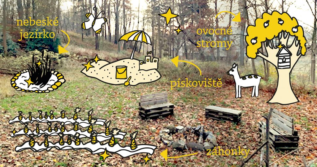 Přes zimu jsme hlavně spřádali plány: Spolu s dětmi jsme nakreslili pocitovou mapu zahrady, podle které designérka Jana Holoubková Vařechová vytvořila projekt: Dětský domov je jako ostrov osaměle plující na mapě města. Přejeme si, aby nezůstal zapomenutý. Aby byl objeven. Leží v zeleni, a ta leží ladem. Cestičky zarostly. Je třeba zakročit proti nevšímavosti, ujmout se opuštěné půdy, osázet ji dobrými nápady a oživit prostor. Jsme realisté – bereme, co je. Naše zahradničení je divoké. … Děláme divy z ničeho, a pak se divíme. Nevadí nám ohnutá záda, ani špína za nehty. Abychom hrábli rukama do hlíny, nepotřebujeme rukavice. Tahle zahrada je proces. Cesta je cíl. Nikdy nebude učesaná, upravená, ani hotová. Nudná a dokonalá. Všechno se tu dá zkusit, nic se nedá pokazit. Zahradničení je záminka, jak se potkat. Navázat konverzaci. Nevíte, o čem mluvit? Pro začátek se bavme třeba o ředkvičkách. Červených a veselých, až to pálí. Každý sem může přijít a být v kontaktu. Zasadit bramboru, uvidět motýla, potkat přátelství, zanechat stopu. V blátě i v srdci.
